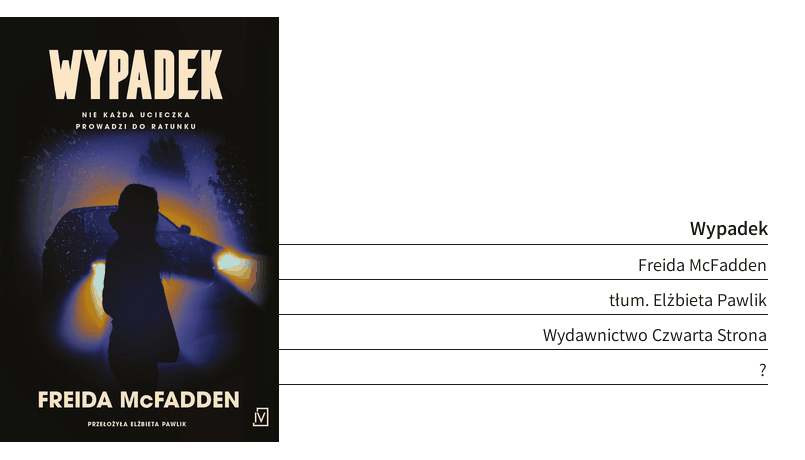 Do tej pory, „Wypadek” to moja druga najulubieńsza powieść Freidy McFadden. Jest duszna, jest niepokojąca, jest druzgocząca – ma w sobie wszystkie te elementy, które tak uwielbiam w tego typu thrillerach. Dreszcz całkiem realnej grozy, który trzyma czytelnika za gardło do ostatniej kropki. Freida McFadden to jedna z najlepszych autorek swojego gatunku, a każda kolejna powieść tylko pogłębia to nasze pierwsze uczucie.